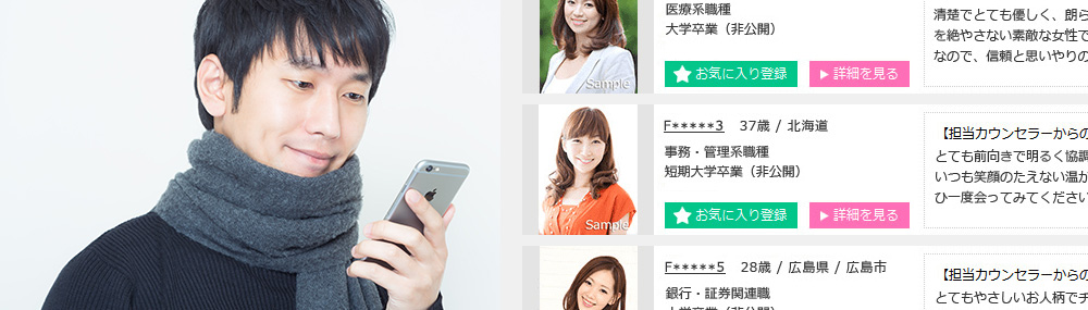 気軽に試せていつでも退会可能です。ご自宅のPCやスマートフォンで、実際に「お相手検索」ができます。お見合いに進みたい場合は、ほかのプランに切り替えとなります。ご不安なことがあればご相談やご質問は何度でも承ります。※お見合いは出来ません。